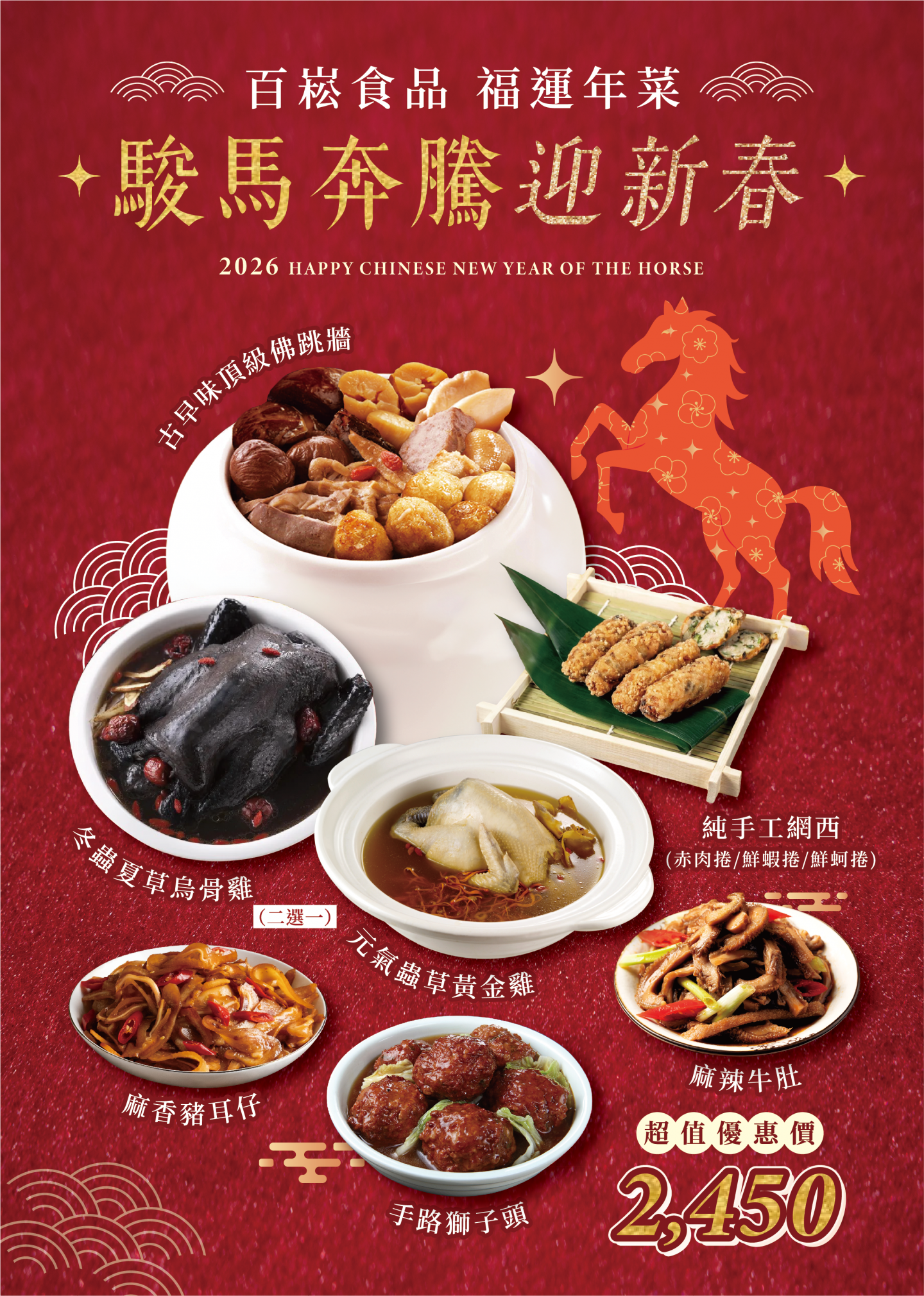 內容包含: • 冬蟲夏草鳥骨雞• 元氣蟲草黄金雞(2選1) • 頂級佛跳墻 • 純手工網西(蝦捲) • 手路獅子頭 • 麻香豬耳仔 • 麻辣牛肚 • 煙燻鳳爪 •QQ包心圓(口味隨機出貨) 限時限量加送• 酸菜牛雙寶 **年菜品項說明** 麻辣牛肚售完後,將改為椒麻牛筋供應。